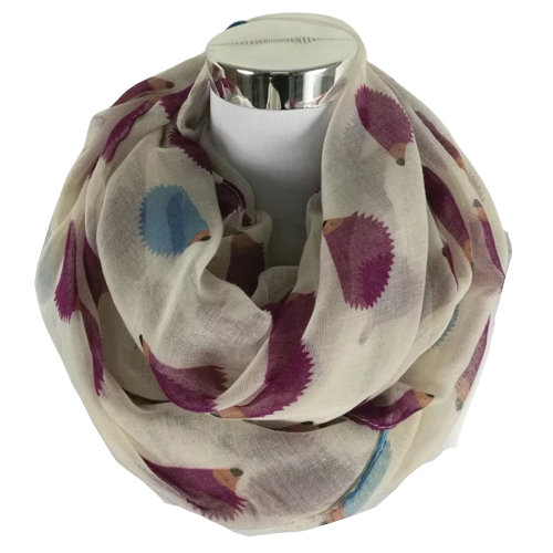 Dette elegante tubetørklæde med pindsvin kombinerer et varmt, neutralt udtryk med fine farvedetaljer. Den beige baggrund danner en smuk kontrast til de mange bordeauxfarvede pindsvin, mens enkelte blå pindsvin tilfører et diskret, moderne twist.