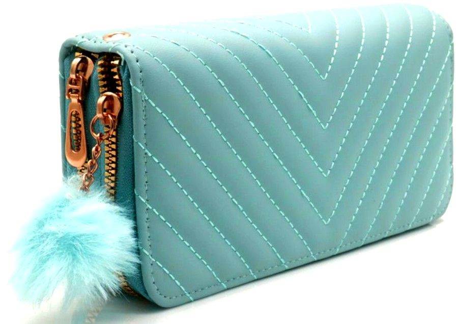 Det gennemførte quiltede mønster i V-form giver pungen et eksklusivt look, mens de gyldne lynlåse skaber en flot kontrast til den blå farve. Den bløde, fluffy blå kvast tilføjer et feminint og personligt præg, der gør denne pung helt unik.