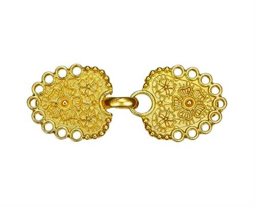 Disse smukke guldfarvede cardigan klemmer kombinerer funktionalitet med et dekorativt, feminint design. Klemmerne er udsmykket med et detaljeret blomsterinspireret ornamentmønster, hvor fine cirkler, små blomster og delikate strukturer skaber et elegant og romantisk udtryk.