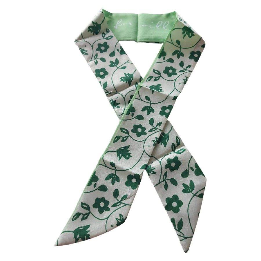 Elegant og feminint smalt tørklæde med et delikat blomsterprint i grønne nuancer på lys baggrund. Det fine, minimalistiske mønster giver et let og moderne udtryk, som passer perfekt til både en afslappet hverdagsstil og et mere sofistikeret look.
