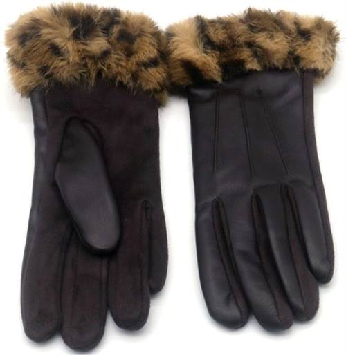 Brune imiteret læder handsker med leopardmønstret kunstpels