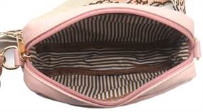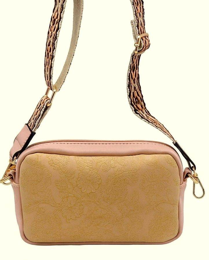 Denne elegante taske med præget blomstermønster kombinerer et feminint udtryk med praktisk funktionalitet. Taskens forside har et smukt, diskret blomstermønster i beige toner, som giver et eksklusivt og tidløst look. De bløde rosa kanter og bagside samt den dekorative skulderrem tilfører tasken et moderne og stilfuldt præg.