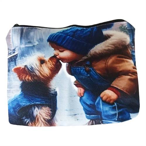 Denne charmerende stoftaske med lynlås er både praktisk og dekorativ. Tasken er prydet med et rørende og hyggeligt motiv af et barn og en lille hund, der deler et kærligt øjeblik. Det varme og stemningsfulde design giver tasken et personligt og unikt udtryk, som især vil appellere til dyreelskere og dem, der holder af søde illustrationer.