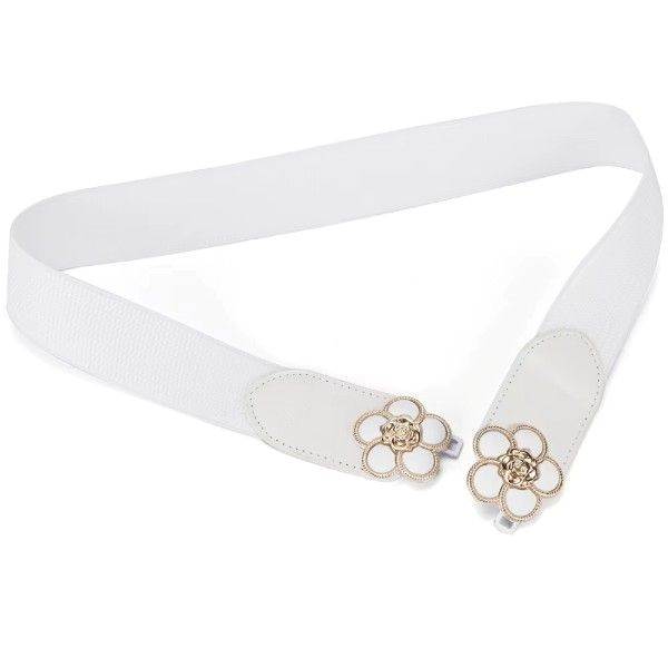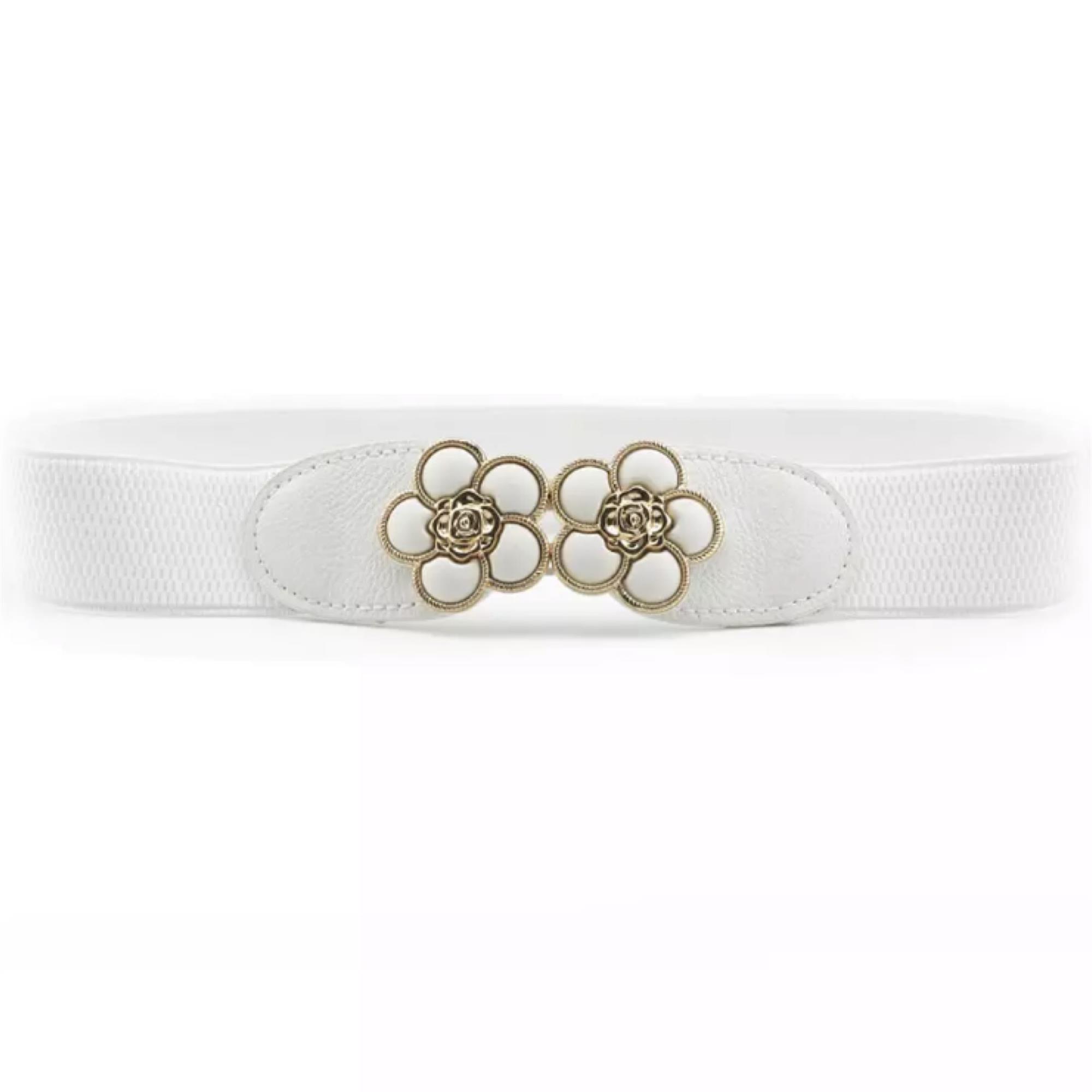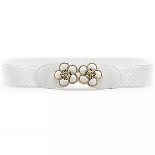 Dette smalle hvide elastik bælte lukkes med to smukke blomster, som udgør spændet. Blomsterne er hvide med en fin guldkant. Et super smukt bælte.