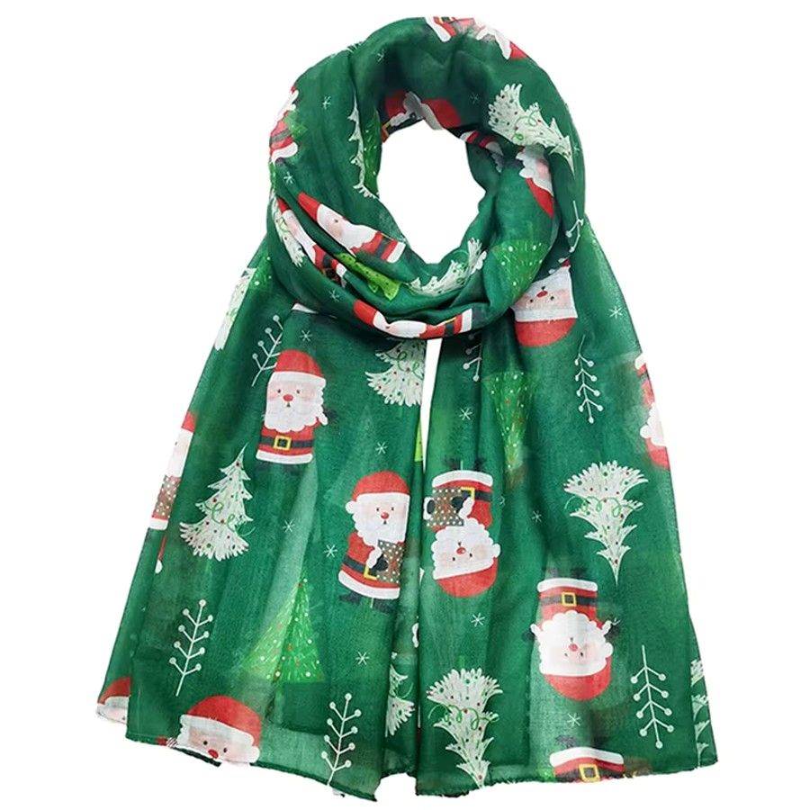 Skab ægte julehygge med dette smukke grønne julehalstørklæde i 100% polyester, dekoreret med charmerende motiver af juletræer og julemænd. Det lette og bløde materiale gør tørklædet behageligt at bære hele dagen, uanset om du bruger det til hverdag, julefrokost eller som et festligt pift til vintergarderoben.