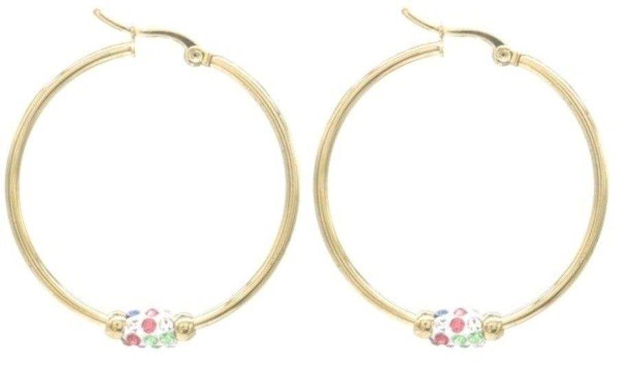 Løft dit look med disse elegante guldfarvede hoop øreringe udsmykket med smukke, farvede sten. Øreringene har en klassisk rund form med en diameter på ca. 4 cm, hvilket giver et let, feminint og iøjnefaldende udtryk uden at virke tunge.