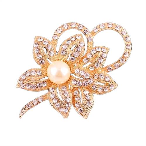 Smuk og feminin guldfarvet metalbroche udformet som en elegant blomst med dekorative slyngede detaljer. Brochen er rigt udsmykket med funklende klare sten, der giver et eksklusivt og iøjnefaldende udtryk, mens den centrale perle tilfører et klassisk og sofistikeret look.