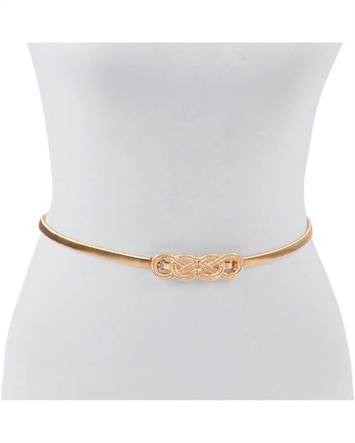 Bæltespændet er et ægte blikfang. Det består af et raffineret, flettet mønster med sammenflettede ovale former, der skaber et elegant og næsten smykke-lignende udtryk. Det guldfarvede metal giver spændet et luksuriøst look, som både passer til hverdagsbrug og mere festlige anledninger.