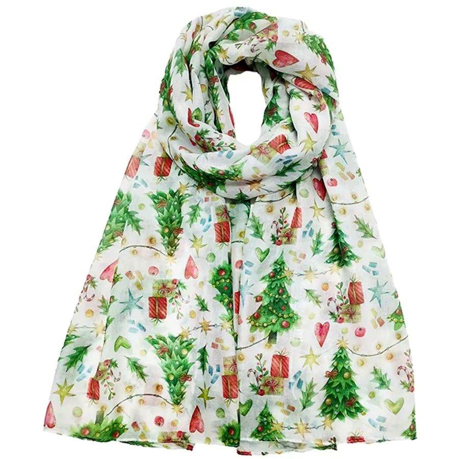 Skab en lys og festlig julestemning med dette elegante juleinspirerede tørklæde i 100% polyester. Det hvide tørklæde er pyntet med smukke, detaljerede julemotiver som juletræer, gavepakker, stjerner, hjerter og små dekorative elementer i røde og grønne nuancer. Det giver et både romantisk og klassisk julelook, der passer perfekt til vinterens outfits.