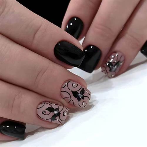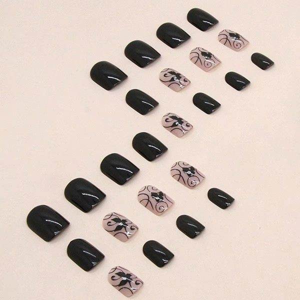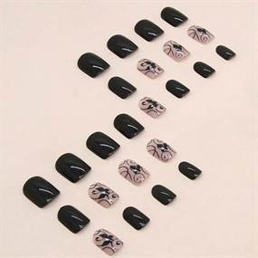 Disse korte press-on nails kombinerer et elegant og moderne look med nem påføring. Sættet består af blanke, sorte negle samt transparente nude-farvede negle dekoreret med snoede linjer, sommerfugle og diskrete rhinsten, som giver et sofistikeret og feminint udtryk.