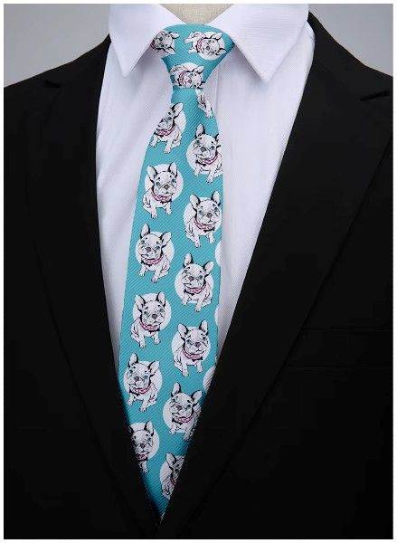 Det lyseblå farvetema kombineret med det sjove bulldog-design gør slipset til et iøjnefaldende accessory, som let kan pifte ethvert outfit op – uanset om det er til kontoret, festen eller en uformel begivenhed.