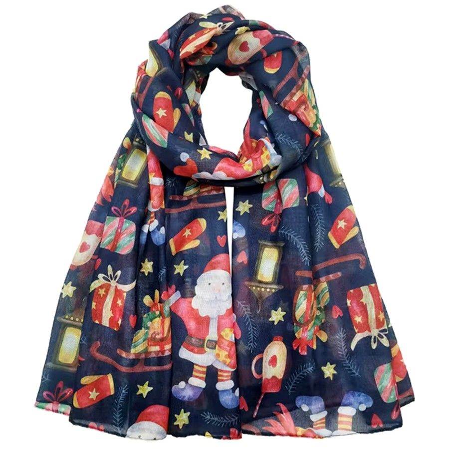 Skab et stemningsfuldt og farverigt julelook med dette flotte mørkeblå tørklæde i 100% polyester, dekoreret med charmerende julemotiver. Mønsteret byder på alt fra julemanden og gaver til stjerner, lanterner, julesokker og hyggelige vinterdetaljer – alt sammen i varme røde, gule og grønne nuancer, der giver et livligt og festligt udtryk.