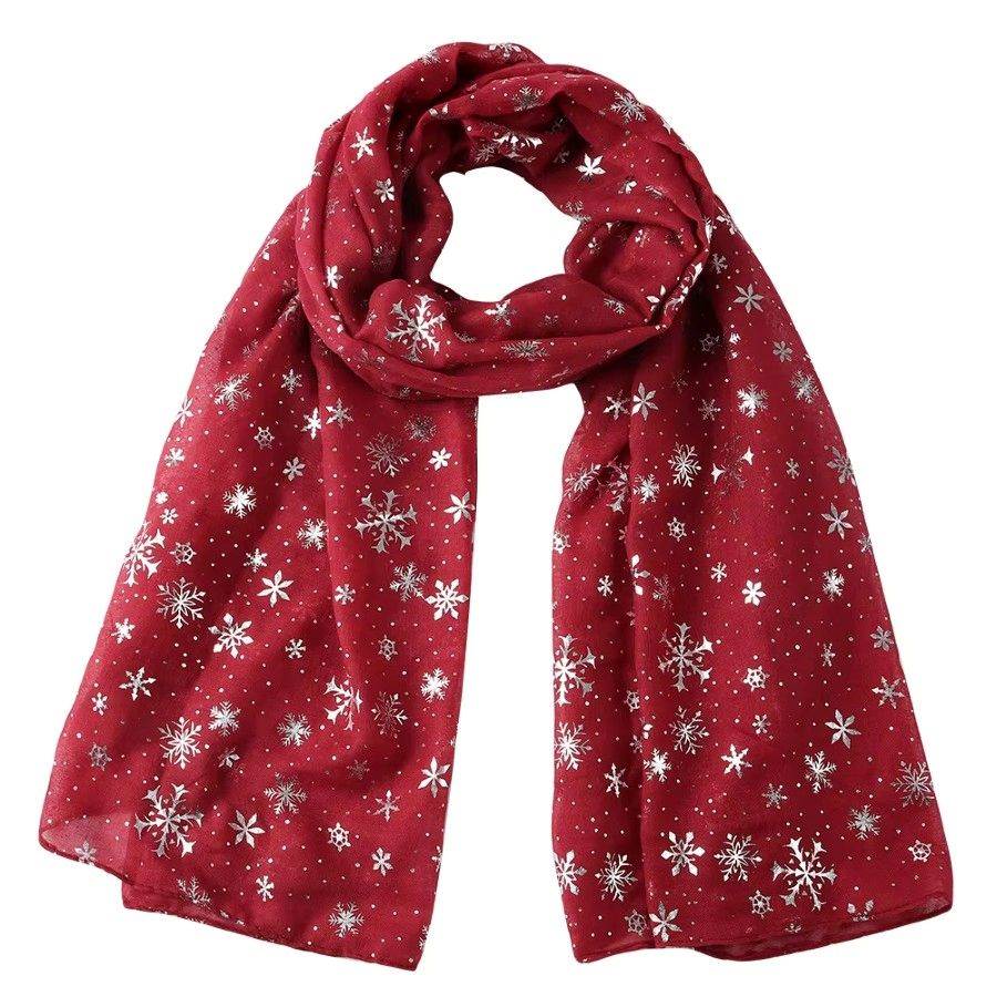 Mørkerødt juletørklæde med sølvfarvede snefnug