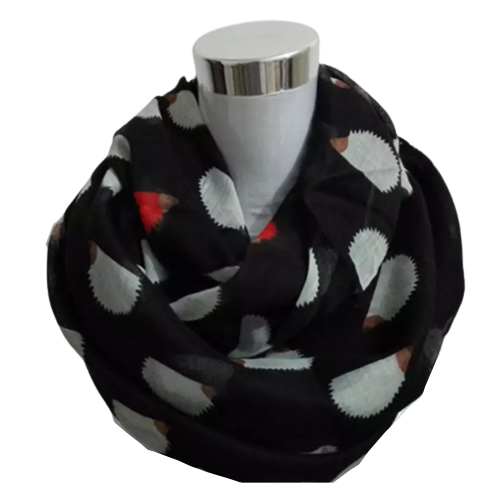Giv dit outfit et legende og stilfuldt twist med dette smukke tubetørklæde med pindsvin. Tørklædet har en elegant sort baggrund dekoreret med hvide pindsvin og enkelte røde pindsvin, som skaber et charmerende og iøjnefaldende udtryk.