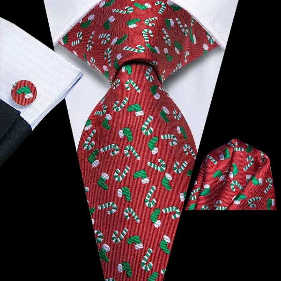 Tilføj et friskt, festligt og stilfuldt twist til julens garderobe med dette eksklusive julesæt bestående af slips, dobbeltsidet lommeklud og matchende manchetknapper. Slipset er fremstillet i 100% håndlavet silke og dekoreret med charmerende julesokker og klassiske slikstokke – et legende og elegant motivvalg, der skaber den perfekte blanding af humor og høj kvalitet.