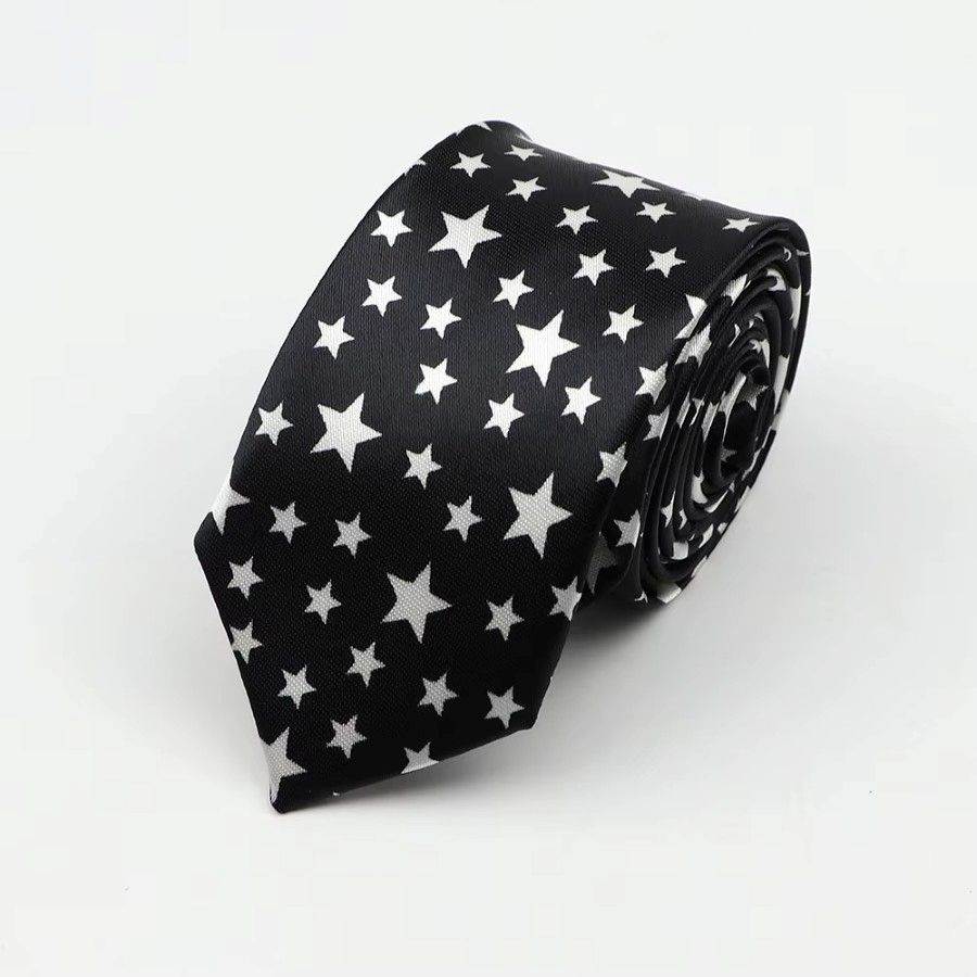Giv dit outfit et unikt og stilfuldt twist med dette elegante sorte slips med hvide stjerner. Slipset kombinerer klassisk sort med et moderne stjernemønster, der gør det til det perfekte valg for dig, der ønsker at skille dig ud uden at gå på kompromis med elegance.