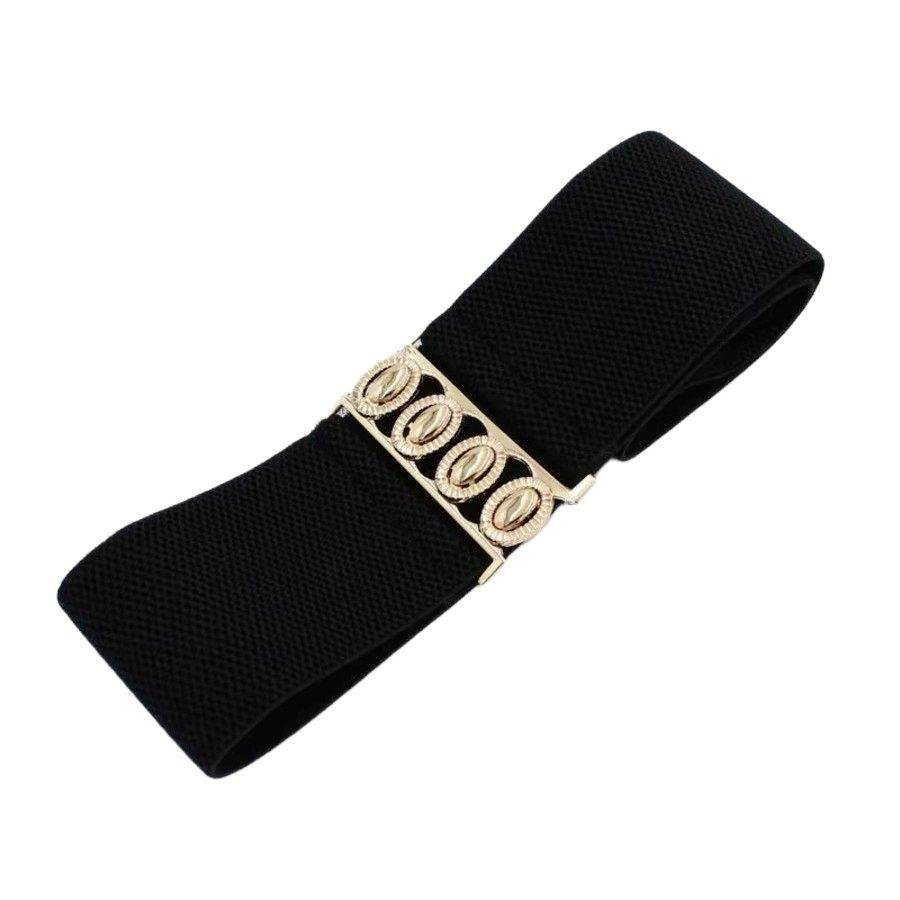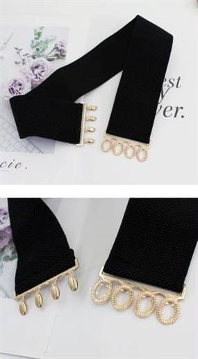 Det brede elastiske materiale giver en smuk, markeret silhuet og gør bæltet perfekt til jakker, kjoler, tunikaer, striktrøjer og lange skjorter. Det dekorative spænde i guldfarvet metal består af fire ovale detaljer, som tilfører et feminint og eksklusivt udtryk – ideelt til både hverdag og fest.